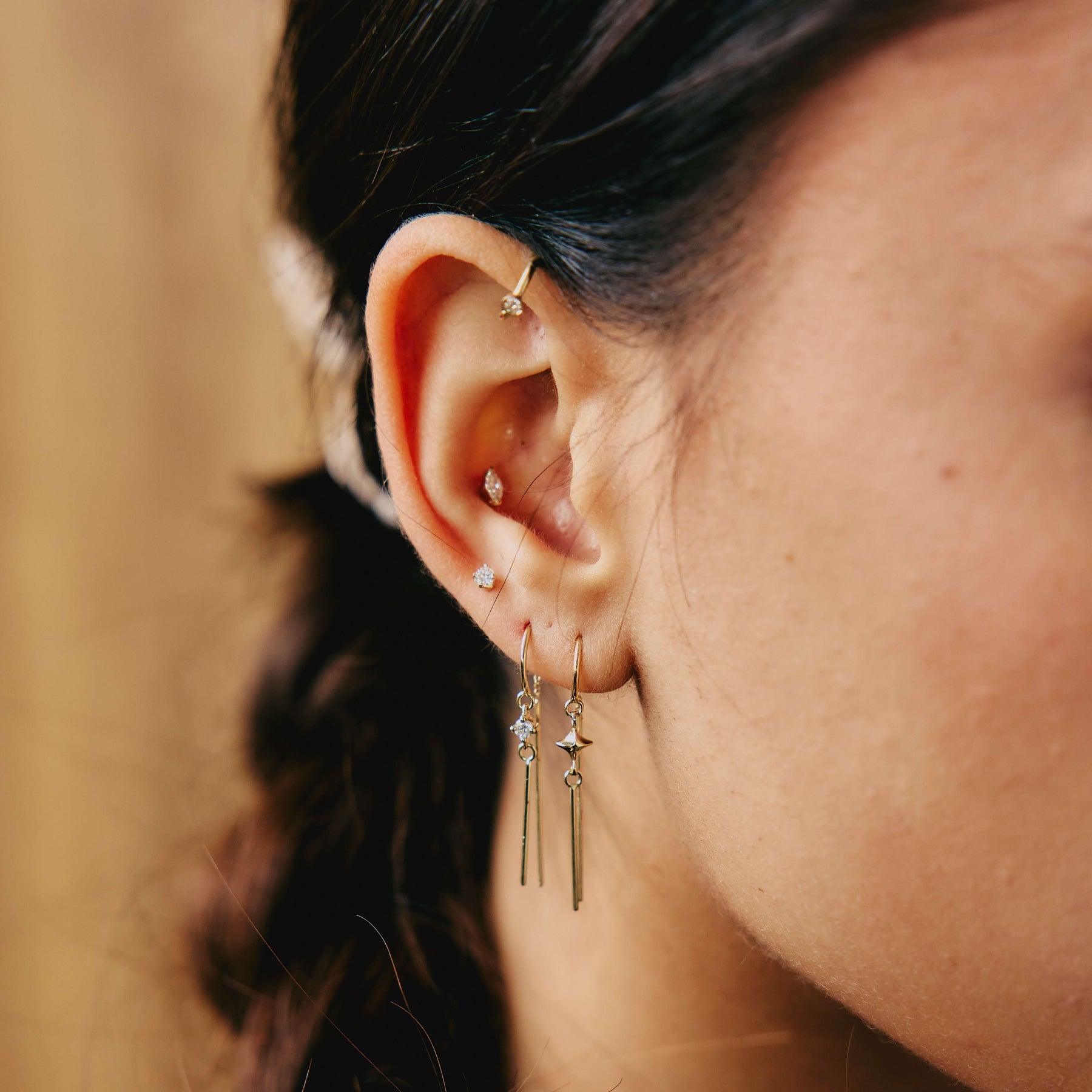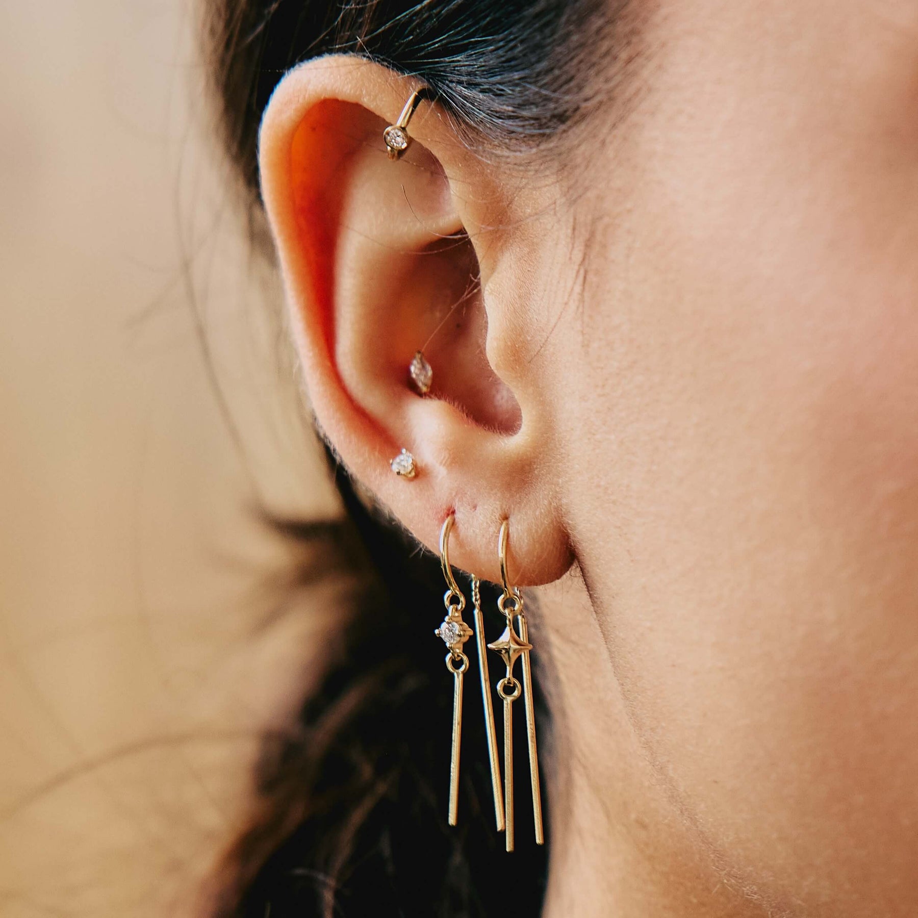 ✦ עגיל חישוק עדין ומתנועע, עשוי זהב 14 קראט עם תליון כוכב ושני תליוני מוטות ישרים תלויים על שרשרת