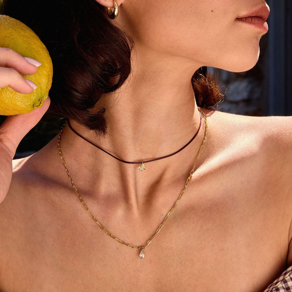 ✦ חוט בגוון בורדו, לבנדר, חום או שחור לבחירה, עשוי כותנה ופוליאסטר עם לולאות וסוגר זהב 14 קראט